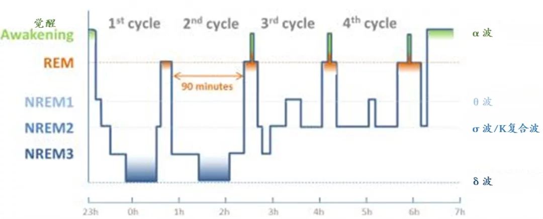 N1期一般很短,大概5分钟左右,初入睡时从N1期过渡到N2之后,就开始进入“-N2-N3-N2-REM-”循环,每个循环持续约90分钟,通常一晚上的睡眠由4-5个循环构成。随着循环进行,深睡期逐渐缩短,REM期逐渐增长,直至醒来,因此我们的深睡眠也多集中在前半夜。